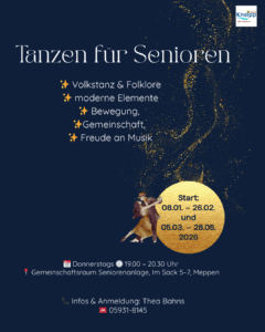 Bewegung, Musik und Gemeinschaft – beim Tanzen für Senioren des Kneippvereins Meppen kommt alles zusammen. Unser Kurs verbindet Seniorentanz, Volkstanz und Folklore mit modernen Elementen. Er eignet sich sowohl für Anfängerinnen und Anfänger als auch für geübte Tänzerinnen und Tänzer.